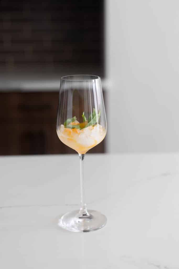 Step 4: Add the ice to a wine or spritz glass, add in the basil, and 3 tablespoons of the mango puree into the glass. Top with the chilled prosecco and garnish with 1 or 2 slices of mango.