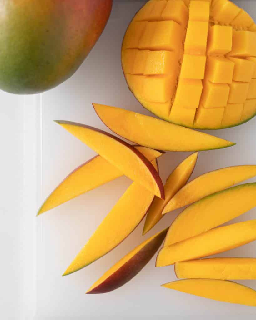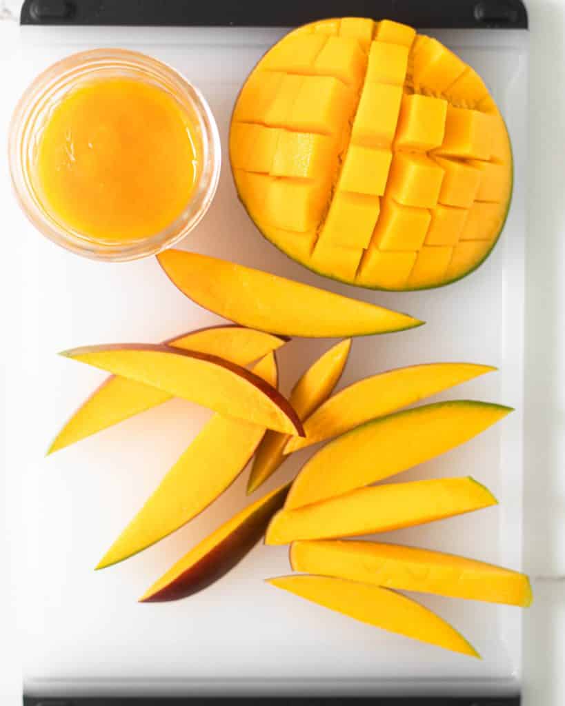 Cutting a mango may seem a little intimidating at first, but it’s a lot easier than you might think, and all you need is a sharp knife. Mangos have one long flat seed in the middle, so you will want to cut vertically on each side of the mango seed when cutting into it. Once you have cut around the seed, you can slice the flesh of the mango into slices or a grid without breaking the skin, then simply scoop the mango out. You can learn more about cutting mango here. For this recipe, I cut my mango into cubes and scooped the chunks into the blender. My mangos were firm enough for me to cut even slices to use as garnish.