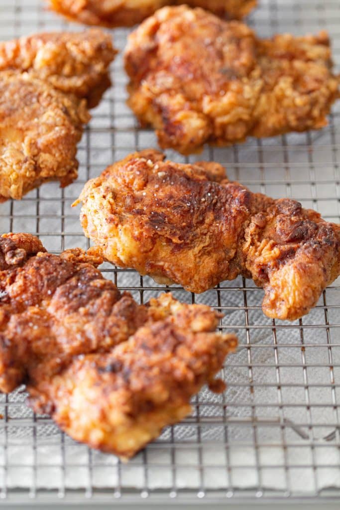 Coat the seasoned chicken in the flour mixture on both sides, dip the chicken in the buttermilk, and then again in the flour mixture. Complete these steps on all of the chicken thighs. Once the canola oil is hot, place the chicken in the frying pan (don’t overcrowd the pan) and fry on both sides until the chicken is golden and thoroughly cooked. The internal temperature should read 165°. When the chicken is done, remove it from the pan and drain the excess oil on a paper towel lined cooling rack.