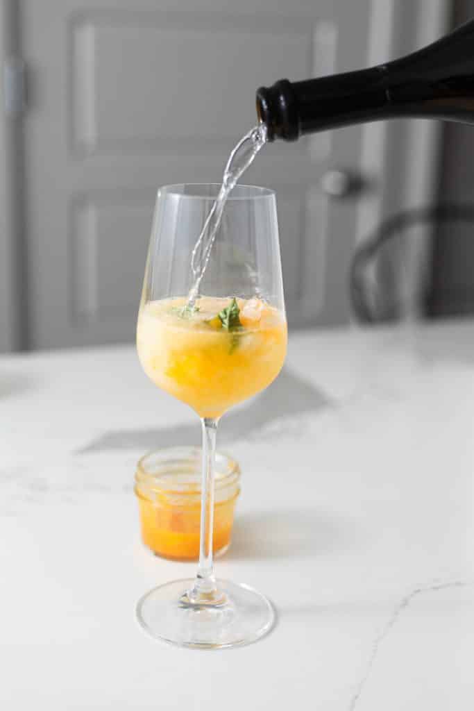 Step 4: Add the ice to a wine or spritz glass, add in the basil, and 3 tablespoons of the mango puree into the glass. Top with the chilled prosecco and garnish with 1 or 2 slices of mango.